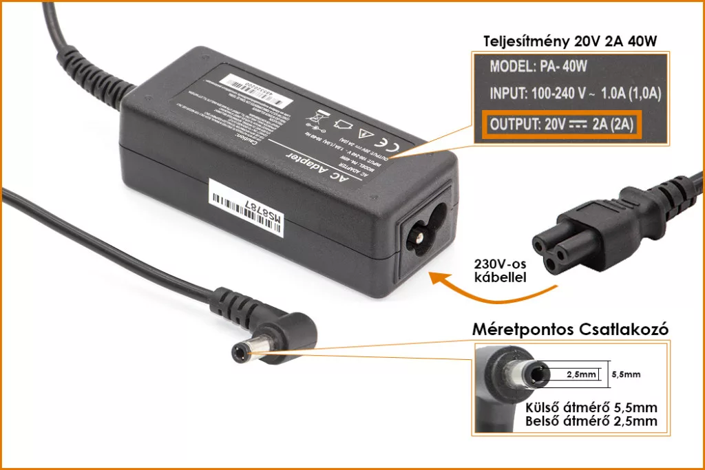 Kerek Csatlakozó méretei, amit a laptopba dugsz: kívül 5,5mm, belül 2,5mm!