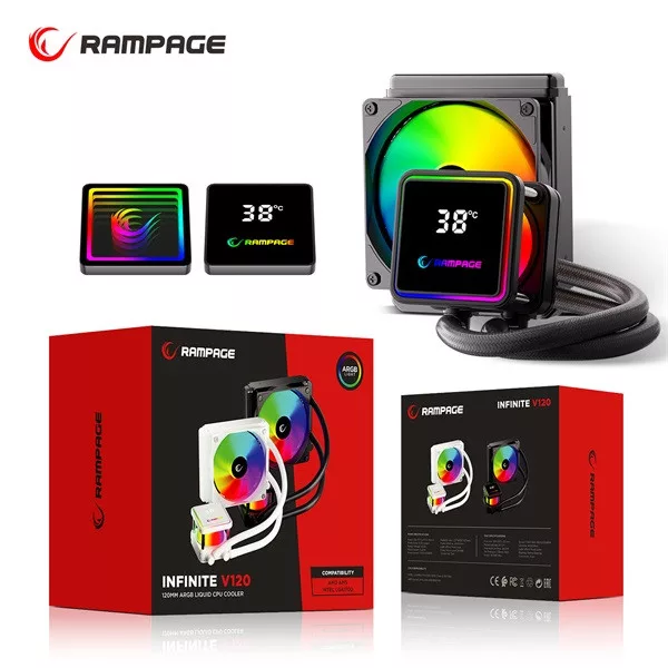 Rampage CPU Water Cooler - INFINITE V120 (Mágneses kijelző, 36,9dB max., 98,54 m3/h; 12cm, A-RGB LED, fehér)