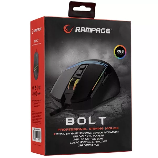 Rampage Egér Gamer - SMX-R76 BOLT (1000DPI, 7 gomb, makro, RGB LED, 1,5m harisnyázott kábel, fekete)