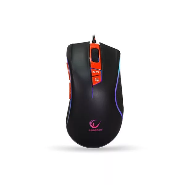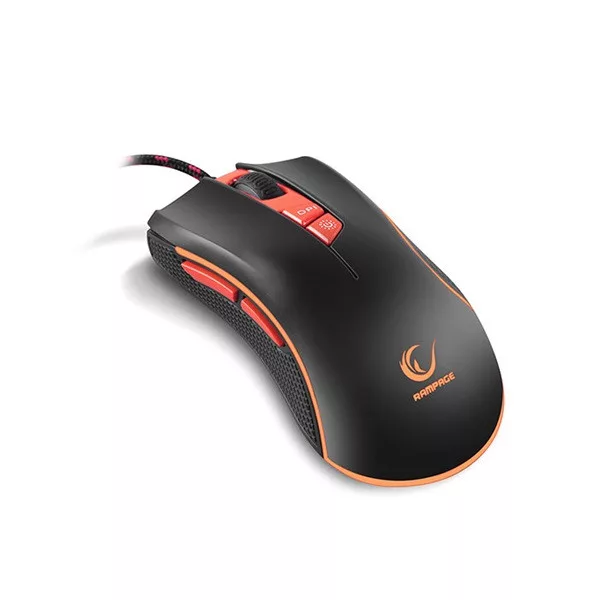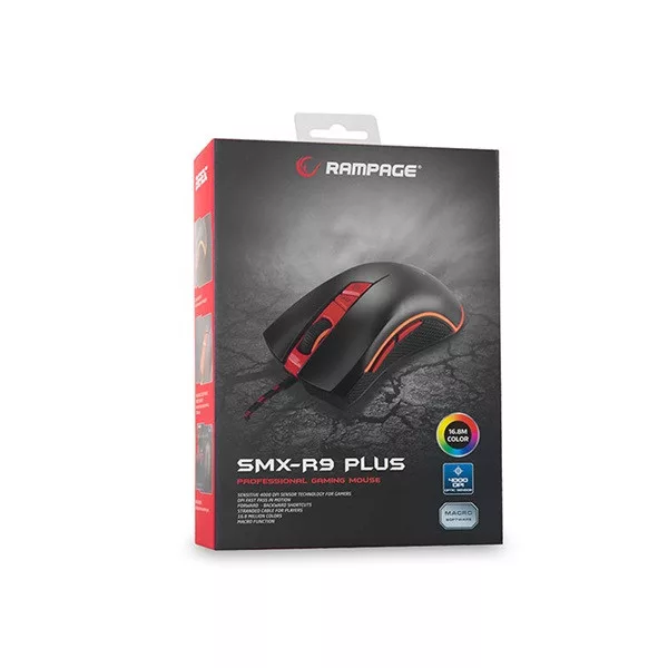 Rampage Egér Gamer - SMX-R9 Plus (Avago 3050, 4000DPI, 6 gomb, makro, RGB LED, harisnyázott kábel, fekete)