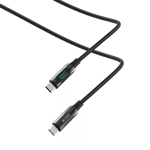 S-Link kábel - LCC-0100 (LED kijelző, 100W, Gyorstöltés, Type-C to Type-C 100cm adat+töltőkábel, fekete, fonott)