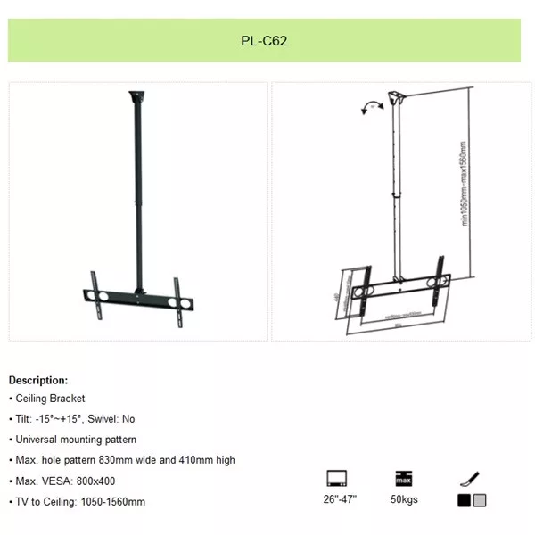 SUNNE (PL-C62) TV mennyezeti konzol, dönthető 37"-70" (ezüst)