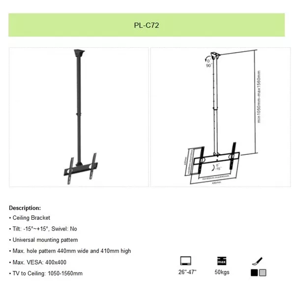 SUNNE (PL-C72) TV mennyezeti konzol, dönthető, 32-55" (fekete)