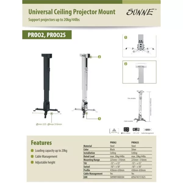 SUNNE (PRO02) Projektor mennyezeti konzol dönthető, Profil: 430-650mm, max 20kg (fekete)