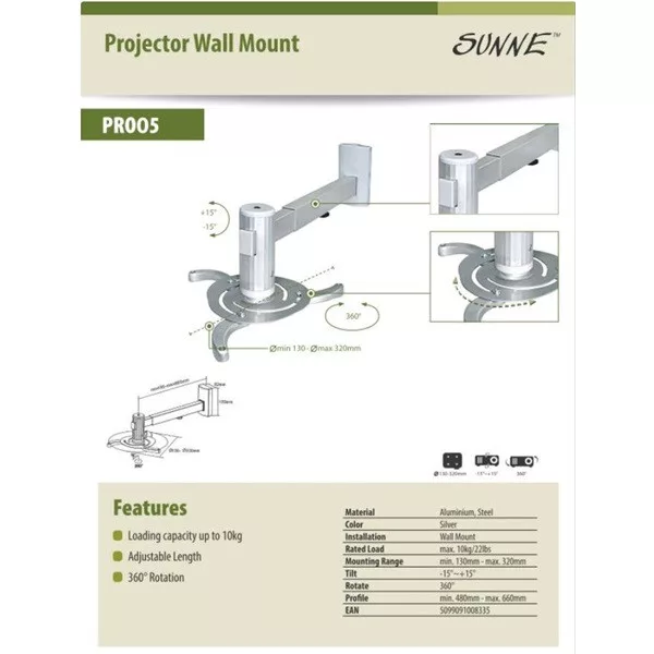 SUNNE (PRO05) Projektor fali konzol dönthető, Profil: 480-660mm, max 10kg (ezüst)