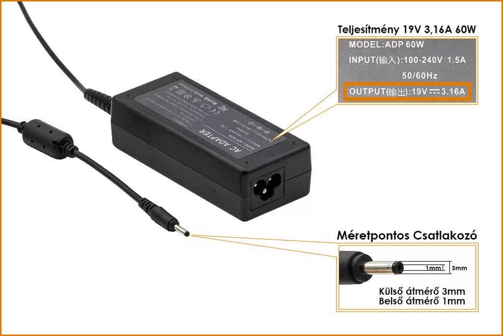 Samsung 19V 3.16A 60W 3mm x 1mm helyettesítő új töltő (AD-6019P)