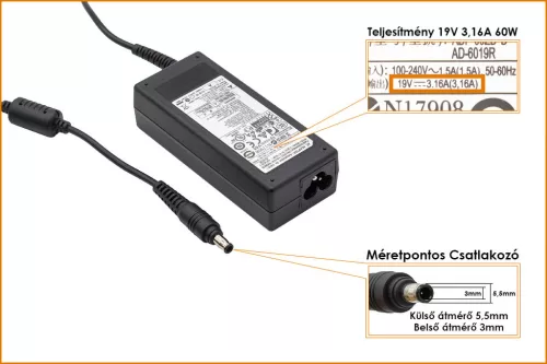 Samsung 19V 3.16A 60W (center pin) gyári új töltő (AD-6019S, AD-6019R)