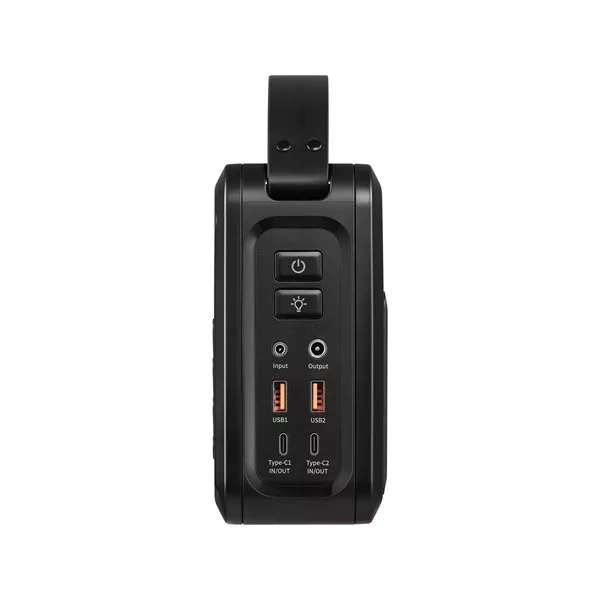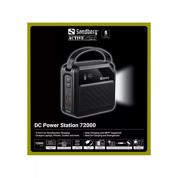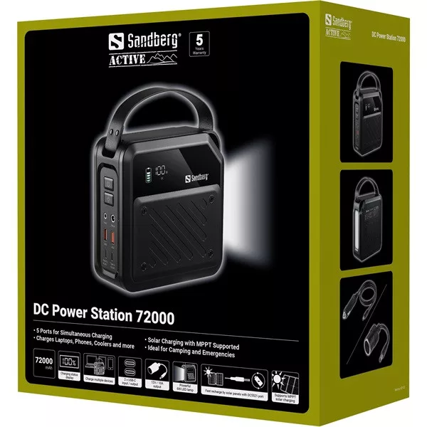 A Sandberg DC Power Station 72000 a te mobil áramforrásod, 72,000 mAh / 270 Wh kapacitással. Két erős 100W-os USB-C PD portot, két USB-A QC3.0 portot akár 22W-ig, és egy 12V-os DC kimenetet kapsz, így töltheted a laptopodat, tabletedet, telefonodat és még sok mást. Mind az öt kimenet egyszerre használható! Férfi és női adapterekkel érkezik az autó 12V-os aljzatához, így könnyedén csatlakoztathatsz autós felszerelést, hűtőt vagy pumpát közvetlenül. Támogatja a töltést mind USB-C-n, mind napelem (MPPT) segítségével a DC bemeneten keresztül. A beépített LED lámpával készen állsz mindenre, a kempingezéstől az áramkimaradásokig.