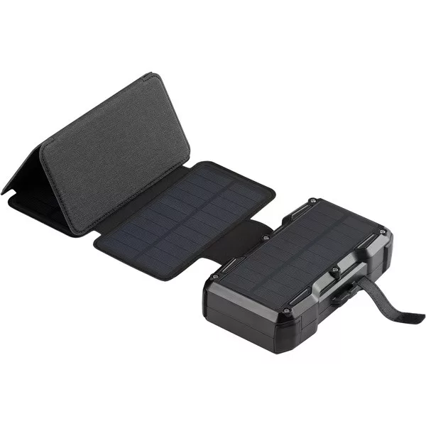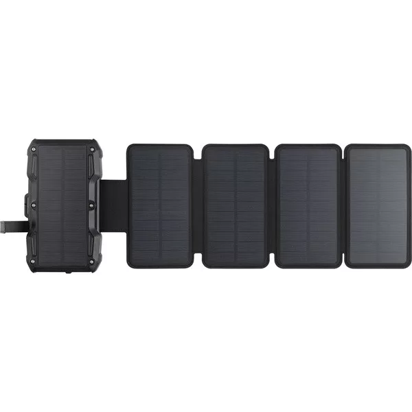 Solar 5-Panel Powerbank 27000 egy nagy teljesítményű 27000 mAh energia-tároló és összehajtható napelem, amelynek segítségével gyorsan és hatékonyan fel tudja eszközeit tölteni napos idő esetén. Amikor például kirándul, erősítse az eszközt a hátizsákjára. Megnyugodhat, hogy mobil eszközei mindig fel lesznek töltve, függetlenül attól, hogy milyen messzire van a legközelebbi konnektortól. A készülés vízálló és rázkódásnak ellenálló anyagokból készült.