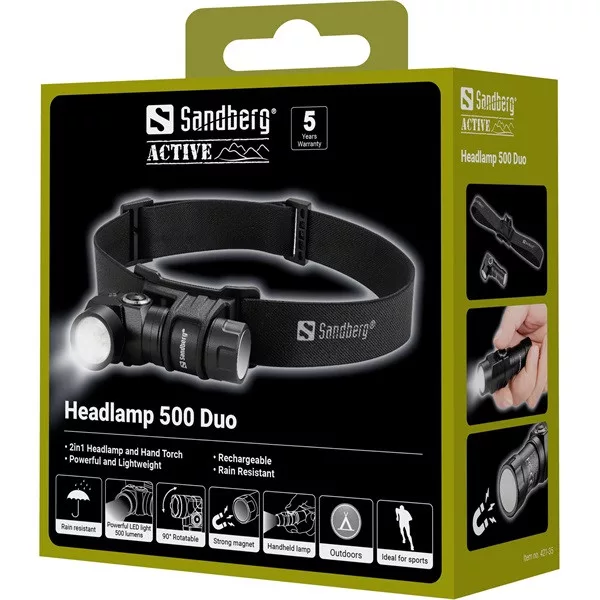 A Sandberg Headlamp 500 Duo a sötétben a rugalmas társad. A lámpa forgatható feje lehetővé teszi, hogy fejlámpaként és kézi zseblámpaként is használd – tökéletes, ha mindkét kezed szabadon kell, és szükséged van egy kézi fényforrásra. Az újratölthető akkumulátorral és a fényes 500 lumenes LED fénnyel mindig megbízható világítás áll rendelkezésedre. A lámpának 5 fénybeállítása van, és lehetőséget biztosít piros fényre is, míg a könnyű fejpánt kényelmes illeszkedést biztosít hosszabb használat során. A vízálló IP44 kialakítás tökéletessé teszi kültéri munkához, kempingezéshez vagy futáshoz enyhe esőben. Töltsd fel USB-n keresztül, és készülj fel bármilyen kalandra.