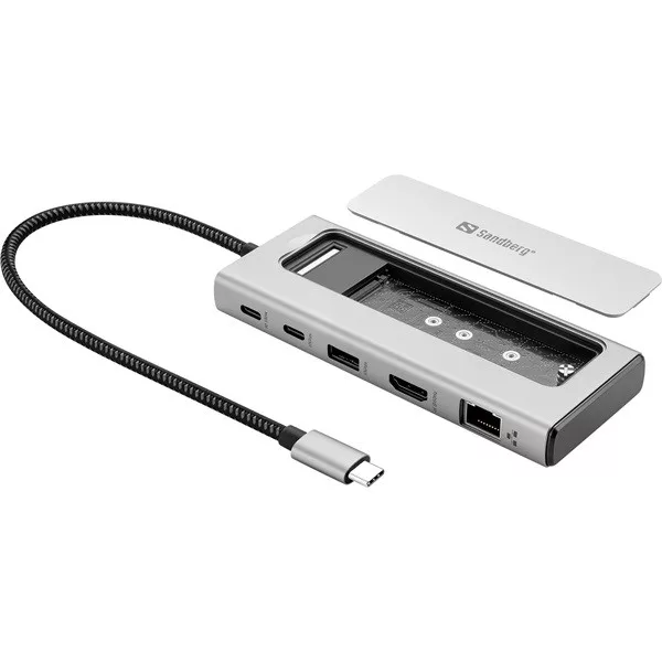 A Sandberg USB-C 6in1 Travel Dock SSD Case egy kompakt eszközben egyesíti az alapvető bővítőportokat és az adattárolási képességet. Csatlakoztasd a laptopodat USB-C-n keresztül, és könnyedén férj hozzá a kijelzőhöz, hálózathoz és extra portokhoz, miközben egy M.2 NVMe SSD-t is behelyezhetsz. A dokkoló megkönnyíti a munkaterület beállítását, akár otthonról, az irodában vagy útközben dolgozol. Csatlakoztathatsz kijelzőt, hálózatot és kiegészítőket, miközben a dokkolón keresztül áramot is továbbíthatsz, így ugyanazzal a kábellel töltheted a laptopodat.