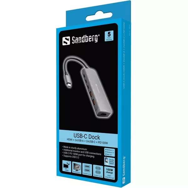 A Sandberg USB-C Dock HDMI + 2xUSB-A + 2xUSB-C + PD100W segítségével a USB-C portot használhatja egy további képernyő, televízió vagy projektor csatlakoztatásához a számítógéphez. Emellett két USB-A port is rendelkezésre áll USB-eszközök csatlakoztatásához, két USB-C port és egy PD port az áramtovábbításhoz, hogy a MacBook/laptop ne merüljön le a dokk használata közben.