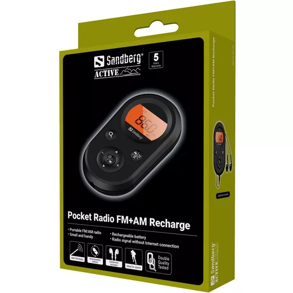 A Sandberg Pocket Radio FM+AM Recharge kompakt és kényelmesen magával viheti a szabadtéri tevékenységekre. Tökéletesen megfelel kocogáshoz, kerékpározáshoz, kempingezéshez és minden ilyen jellegű tevékenységhez. Sőt, ideálisan használható vészhelyzeti rádióként is, ha az elektromos hálózat és az internet meghibásodik. Beépített újratölthető akkumulátorral. Mellékelt fülhallgatók, melyek egyben antennaként is működnek az FM és AM rádiójelek vételéhez.