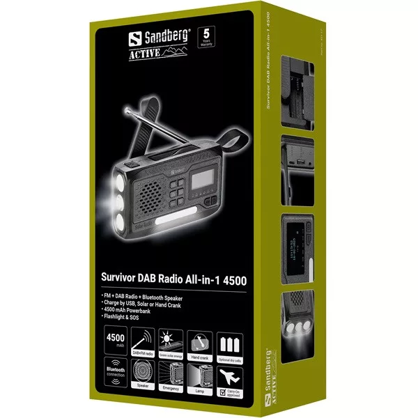 A Sandberg Survivor DAB Radio All-in-1 4500 több funkciót egyesítő kompakt és tartós eszköz. Akár a vadonban kalandozik, akár vészhelyzettel szembesül, mindent megtalál benne, amire szüksége van. A készülék powerbankként szolgál okostelefonja töltéséhez, Bluetooth hangszóróként a telefonjáról történő zenei streaminghez, valamint DAB és FM vétellel rendelkező rádióként is használható. A beépített napelemmel és kézi hajtókarral akkor is feltölthető, ha nincs áram, és alternatív megoldásként AAA elemekkel is működik. Emellett világításra zseblámpaként és olvasólámpaként egyaránt használható. The Sandberg Survivor DAB Radio All-in-1 4500 minden helyzetre készen áll.