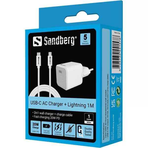 A Sandberg USB-C AC Charger + Lightning 1M egy praktikus töltő aljzatokhoz. USB-C 20W PD kimenettel van felszerelve, így okostelefonokat és táblagépeket tölthet teljes sebességgel.