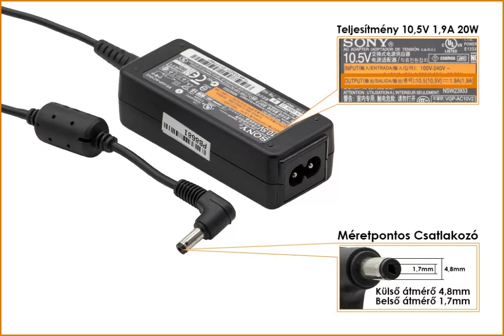 Sony 10.5V 1.9A 20W gyári új netbook töltő (VGP-AC10V2, VGN-P)