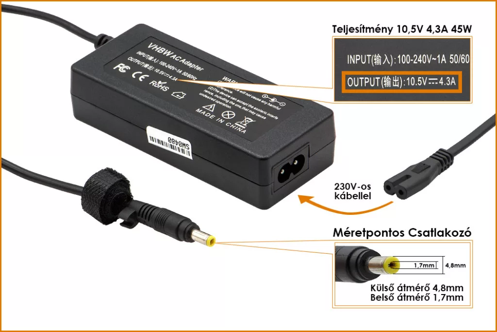 Kerek Csatlakozó méretei, amit a laptopba dugsz: kívül 4,8mm, belül 1,7mm!