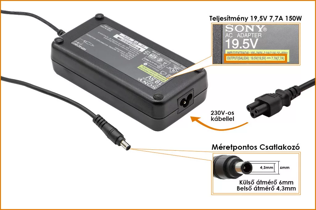 Eredeti, Gyári 150 Wattos laptop töltő Sony laptophoz.