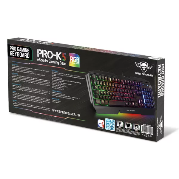 Spirit of Gamer Billentyűzet - PRO-K5 (105 gomb, Fém felső rész, RGB LED, USB, 19 anti-ghost, fekete, magyar)