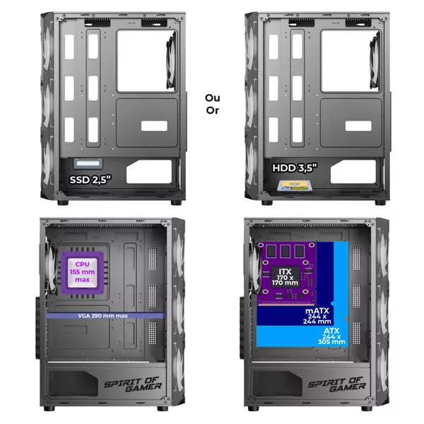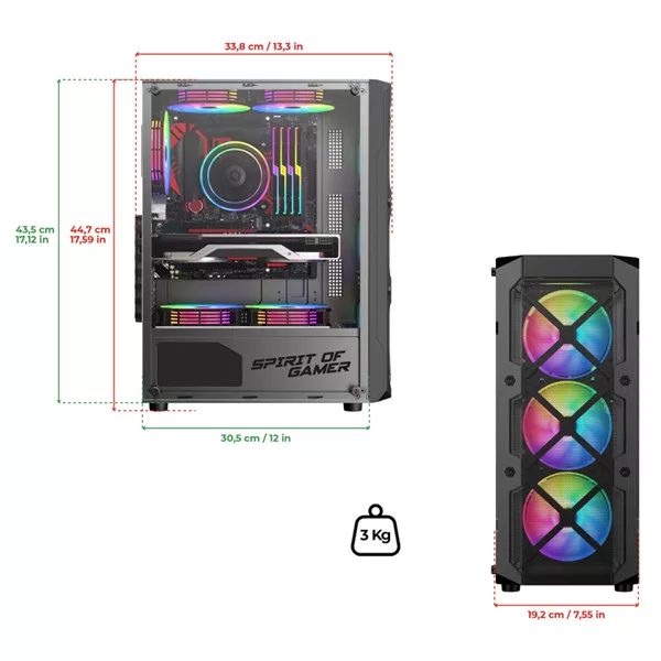Spirit of Gamer Számítógépház - REBEL XT Black (fekete, ablakos, 4x12cm ventilátor, alsó táp, ATX, 1xUSB3.0, 2xUSB2.0)