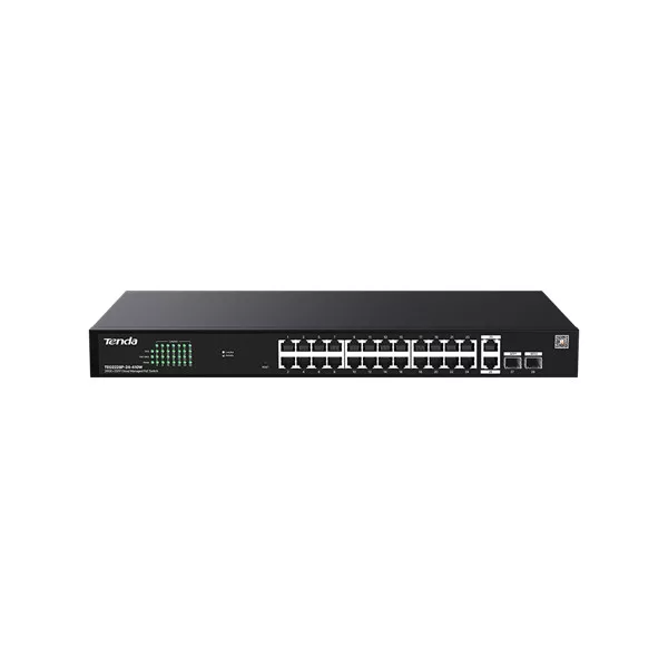 Tenda Switch Menedzselhető PoE - TEG2228P-24-410W (24x1Gbps + 2x1Gbps Uplink + 2xSFP; 24af/at PoE+ port; 410W; rack)