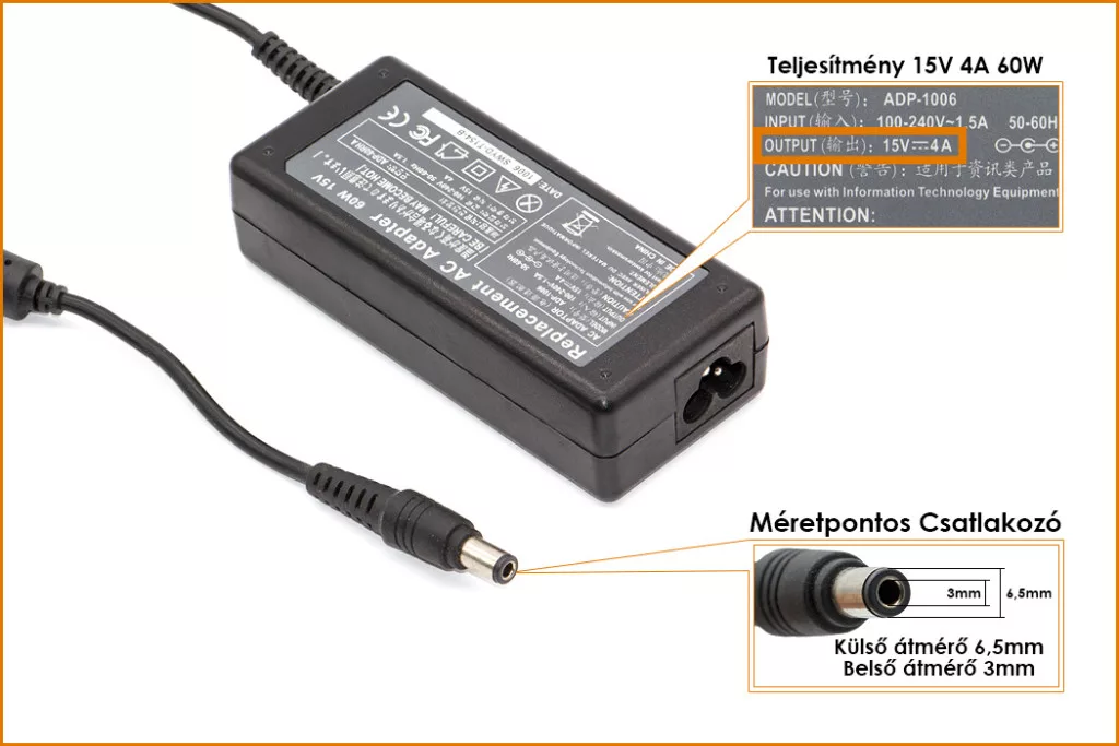 Kerek Csatlakozó méretei, amit a laptopba dugsz: kívül 6,5mm, belül 3mm!