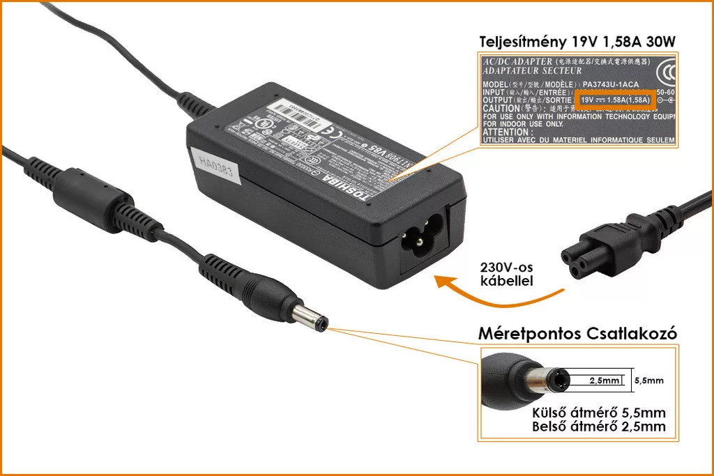 Toshiba 19V 1.58A 30W gyári új netbook töltő (PA3743U-1ACA, PA3743E-1AC3)