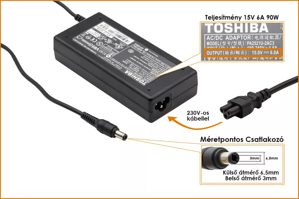 Kerek Csatlakozó méretei, amit a laptopba dugsz: kívül 6,5mm, belül 3mm!