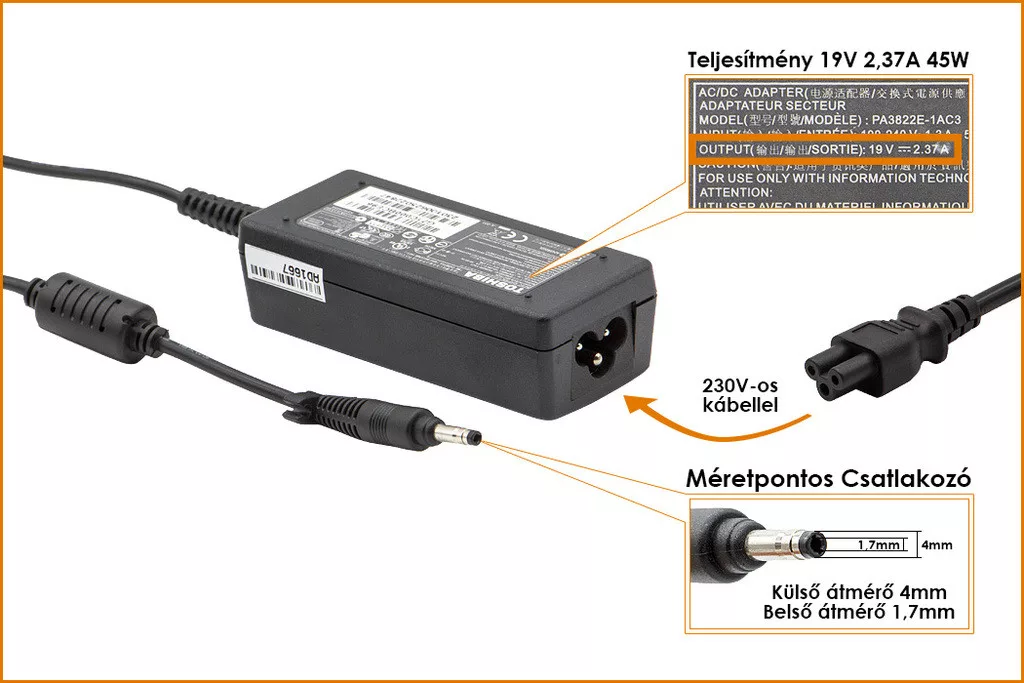 Kerek Csatlakozó méretei, amit a laptopba dugsz: kívül 4mm, belül 1,7mm!