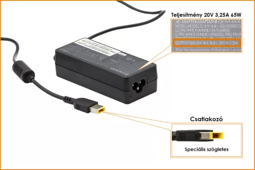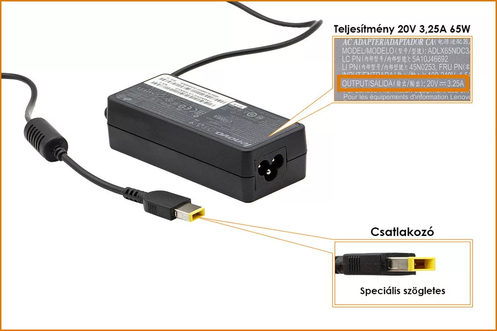 Lenovo 20V 3.25A 65W használt gyári töltő, sárga téglalap alakú csatlakozóval, 45N0256