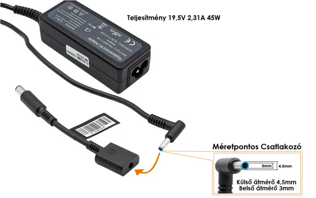 HP Compaq 19.5V 2.31A 45W center-pin, középső tüskés helyettesítő töltő (744481-003, 744893-001)
