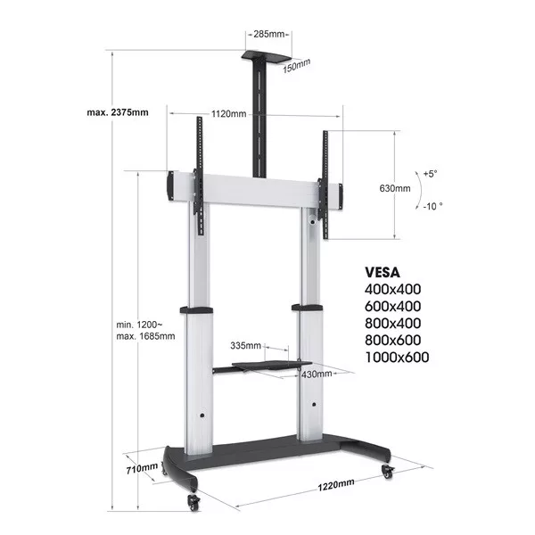 Manhattan gurulós TV állvány - 1db monitor részére, dönthető + polc (max.VESA:1000x600)(60" - 100"-ig) 100kg teherbírás