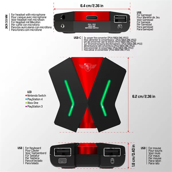 Spirit of Gamer Egér/Billentyűzet adapter konzolokhoz - SOG-CONV2 (Audio, 3x USB-A, 2x USB-C, Nintendo/PS4/PS3/Xbox One)